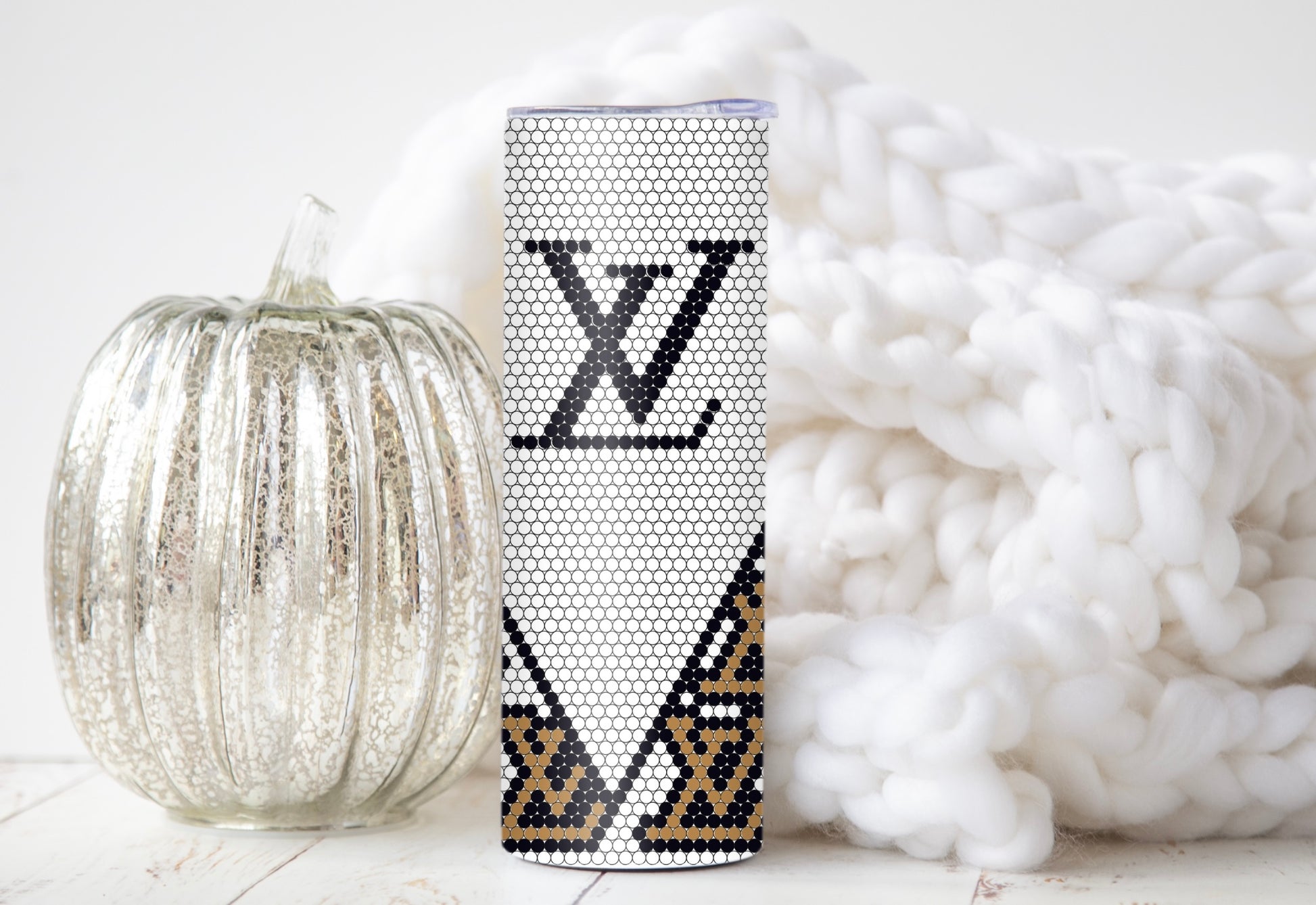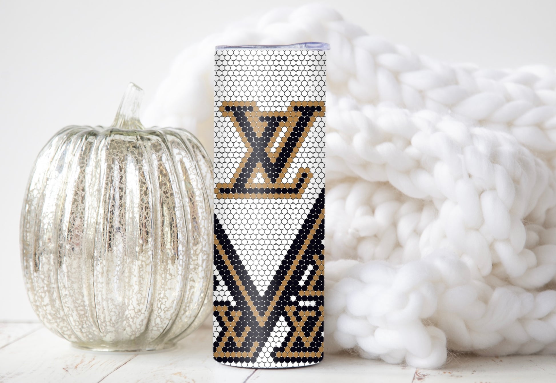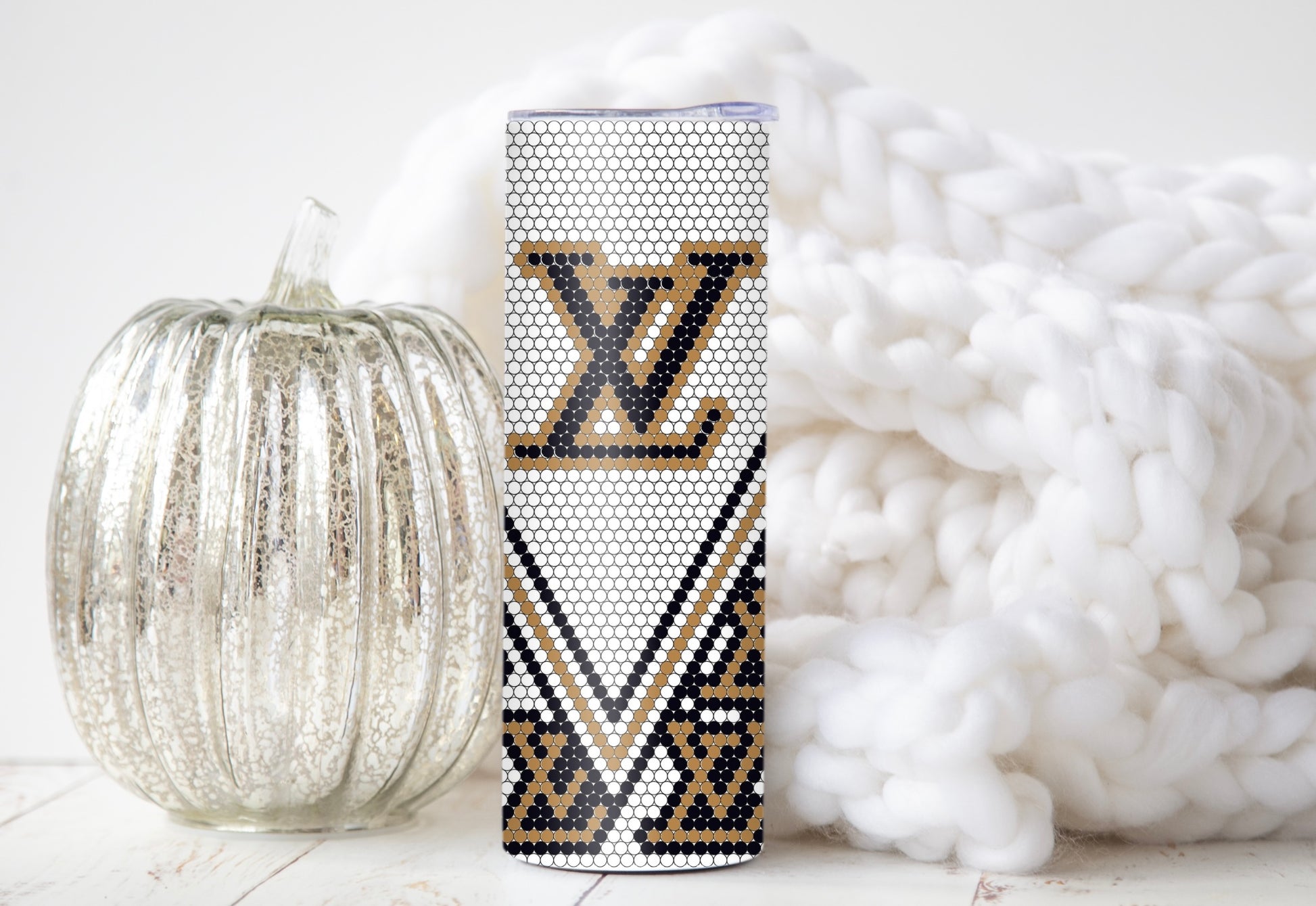 The pattern I have created has been tested out on a straight 20oz stainless steel double walled tumbler measuring approximately 23.3cm by 20.8 cm. Different tumbler brands and makes could have different measurements so make sure that you can fit the same number of rhinestones in a row as the pattern requires for. Making adjustments to the pattern by adding or deleting rhinestones will change the look of the pattern design.